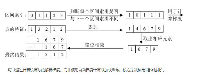 该模型使用的是Pillar的累积求和池化,“累积求和”是通过bin id 对所有点进行排序,对所有特征执行累积求和,然后减去 bin 部分边界处的累积求和值来执行求和池化。无需依赖 autograd 通过所有三个步骤进行反向传播,而是可以导出整个模块的分析梯度,从而将训练速度提高 2 倍。 该层被称为“Frustum Pooling”,因为它处理将 n 个图像产生的截锥体转换为与摄像机数量 n 无关的固定维度 C × H × W 张量。