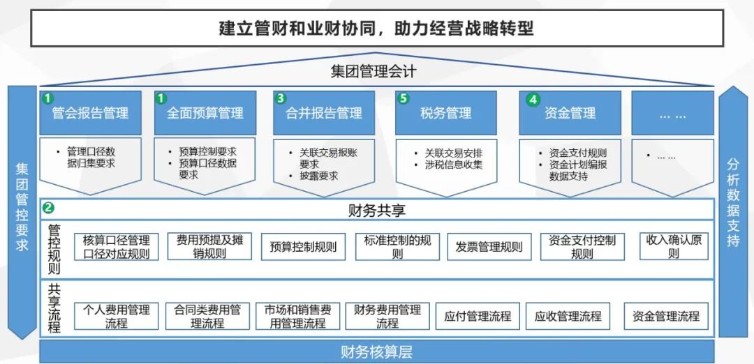 我们认为,面向业务战略要求的企业财务数字化转型建设通常包括以下关键专题: