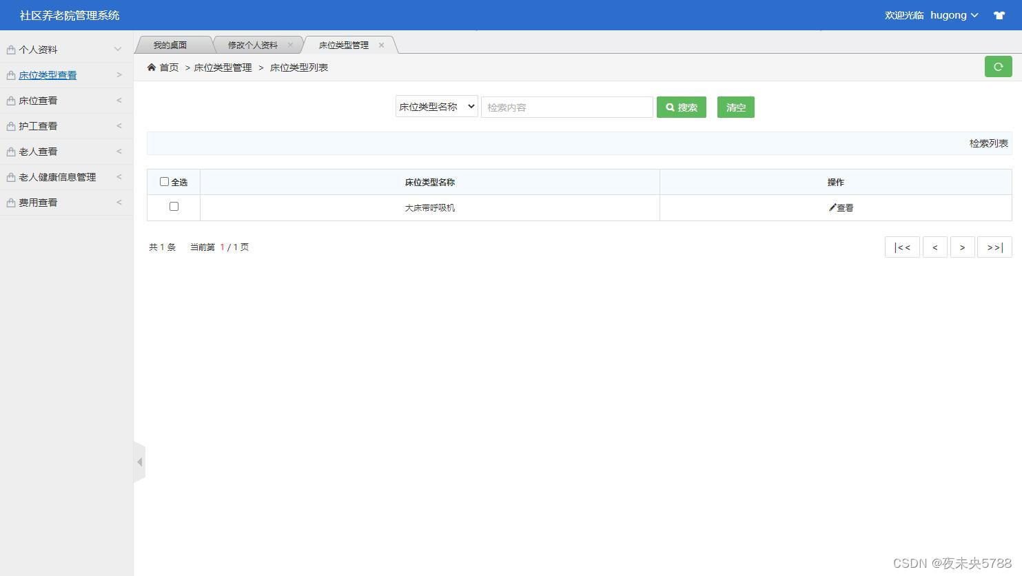 护工登录,个人资料修改,床位类型查看,床位查看,护工查看,老人查看,健康信息上报管理,费用查看等功能。