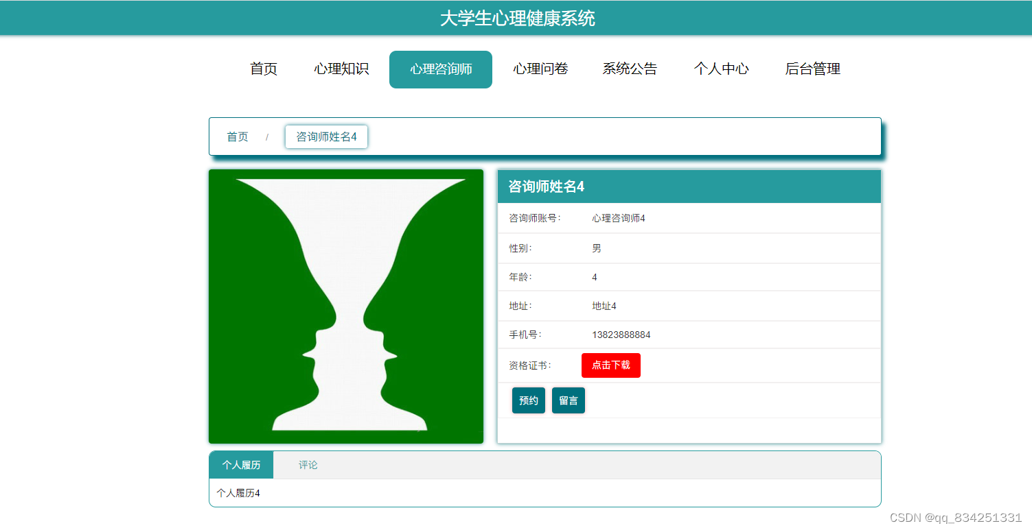 大学生心理健康系统的主要使用者分为管理员和学生、心理咨询师,实现功能包括(1)管理员:首页、个人中心、学生管理、心理知识管理、心理咨询师管理、在线预约管理、在线留言管理、心理问卷管理、问卷测评管理、问卷评分管理、系统管理,(2)学生:首页、个人中心、在线预约管理、在线留言管理、问卷测评管理、问卷评分管理、我的收藏管理;(3)心理咨询师:首页、个人中心、心理知识管理、在线预约管理、在线留言管理、心理问卷管理、问卷测评管理、问卷评分管理,(4)前台首页;首页、心理知识、心理咨询师、心理问卷、系统公告、个人中心、后台管理等功能。由于本网站的功能模块设计比较全面,所以使得整个心灵治愈交流平台信息管理的过程得以实现。