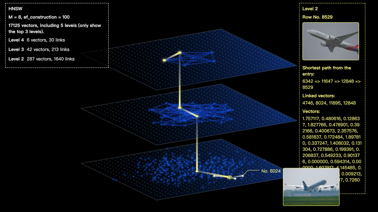 当我们利用 hnsw 索引进行向量搜索时,会优先使用上层的网络,就像乘坐飞机一样,它提供更快的速度(更少的中转),但是单靠上层网络并不能直接找到与输入对象相似的目标对象。这时,我们需要继续向下层网络进行数据查找,来获得更高的数据精度。同样地,我们在现实生活中也需要换乘其他交通工具,例如铁路、高速公路、普通公路等等。(这里有一个细节,hnsw 在构建时会选取最上层的一个节点作为固定入口,每次查询都将从该入口出发)