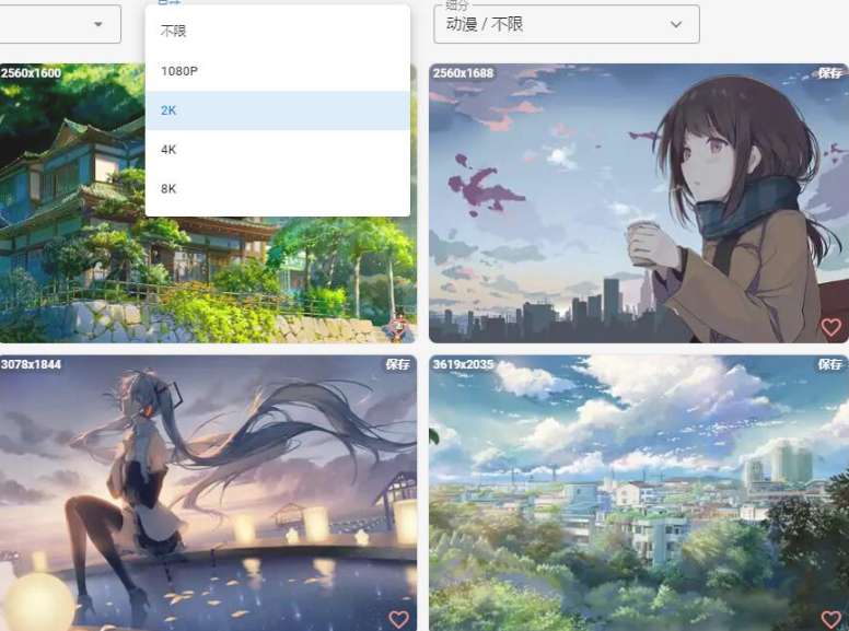 也能按照壁纸尺寸进行筛选,包括1080P、2K、4K、8K。