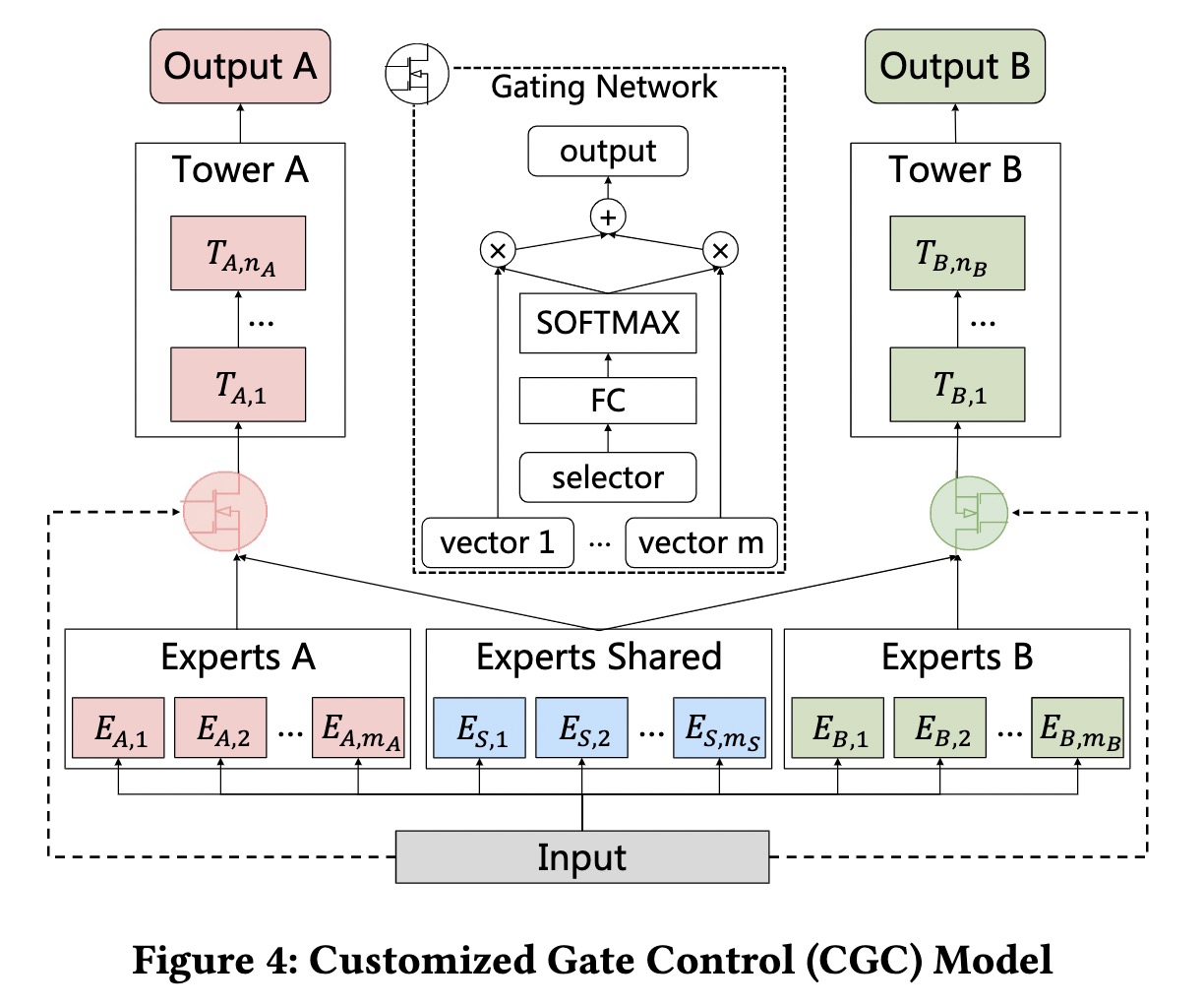 CGC网络的好处是即包含了task-specific网络独有的个性化信息,也包含了shared网络具有的更加泛化的信息,文章指出虽然MMoE模型在理论上可以得到同样的解,但是在实际训练过程中很难收敛到这种情况。