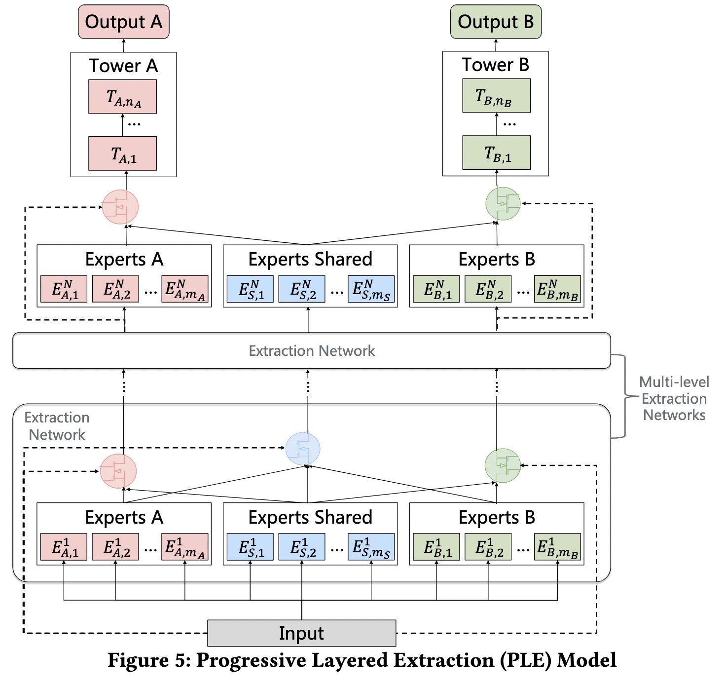 上面看到了CGC网络是一种single-level的网络结构,一个比较直观的思路就是叠加多层CGC网络(获得更加丰富的表征能力),而PLE网络结构就是将CGC拓展到了multi-level下。具体网络结构如下图所示。
