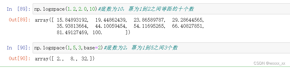 等比数列 logspace(start,stop,num,endpoint,base,dtype)