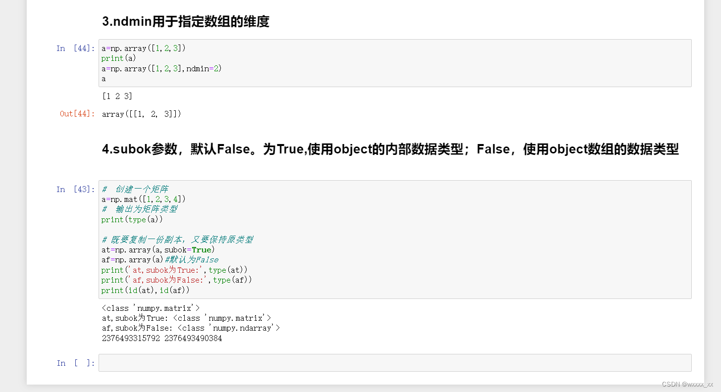 - subok 可选参数,类型为bool值,默认False。为True,使用object的内部数据类型;False:使用object数组的数据类型