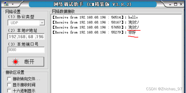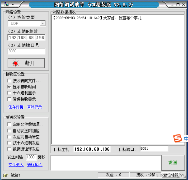 方式一:通过网络调试助手接收(下载地址:NetAssist.exe下载)