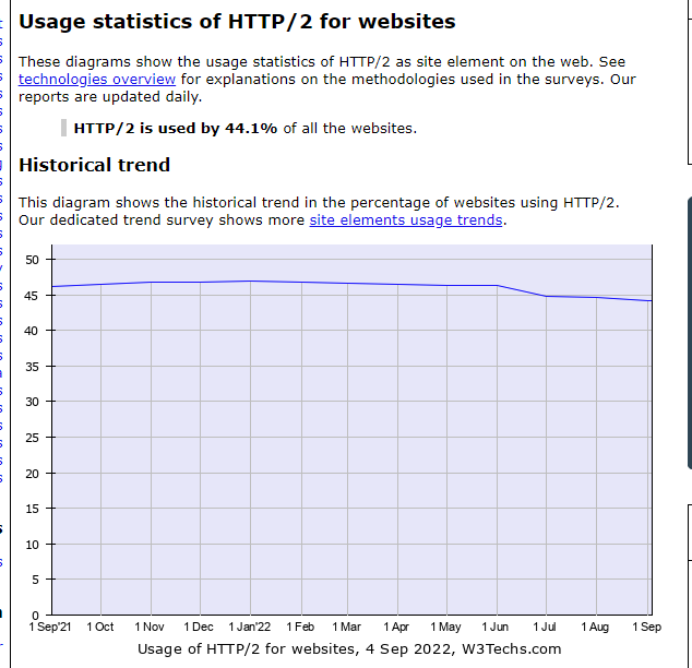 HTTP/2 是 HTTP 协议的主要修订版,从 2015 年左右开始出现。现在大约一半的网站使用 HTTP/2