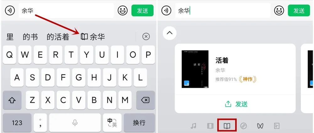 比如在搜索“余华”时,键盘中就会出现带有书本翻页的动态图标,点开之后,就能看到余华的作品,点击发送,就会发送出微信读书的小程序▼