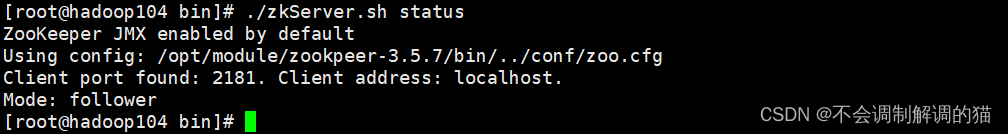 - ssh $i "/opt/module/zookeeper-3.5.7/bin/zkServer.sh status"