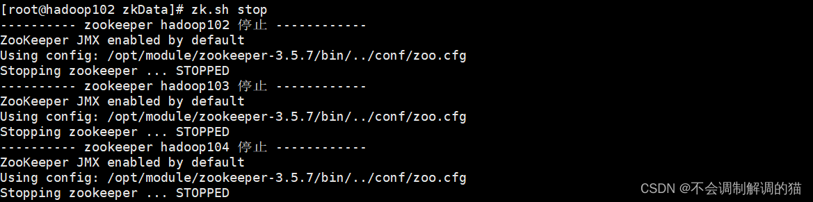 - ssh $i "/opt/module/zookeeper-3.5.7/bin/zkServer.sh stop"