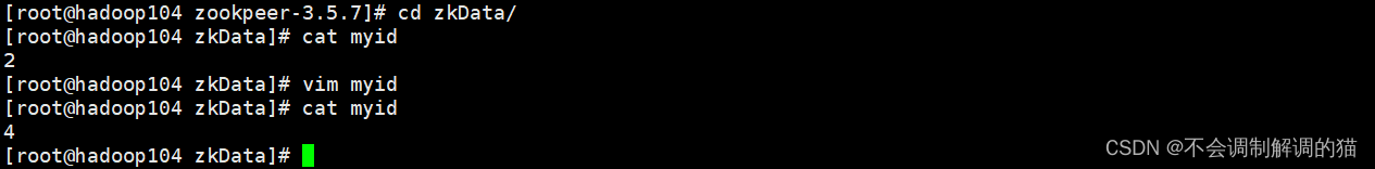 echo '4' > /opt/module/zookeeper-3.5.7/zkData/myid