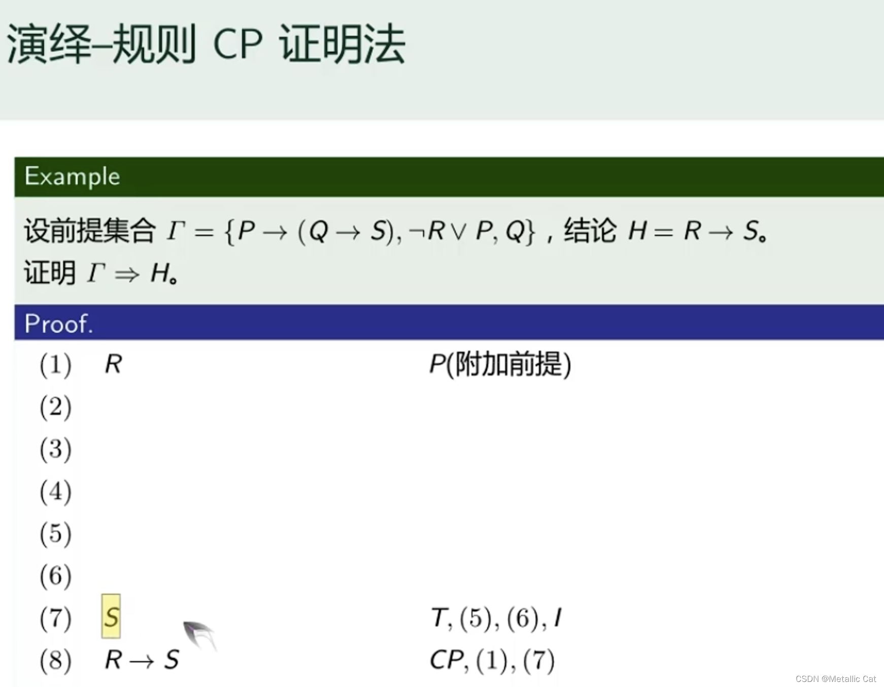 同时在推理出的最终结果命题公式后面将T改为CP,以及CP后面跟着附加前提的位置和通过附加前提推导出的结果的位置