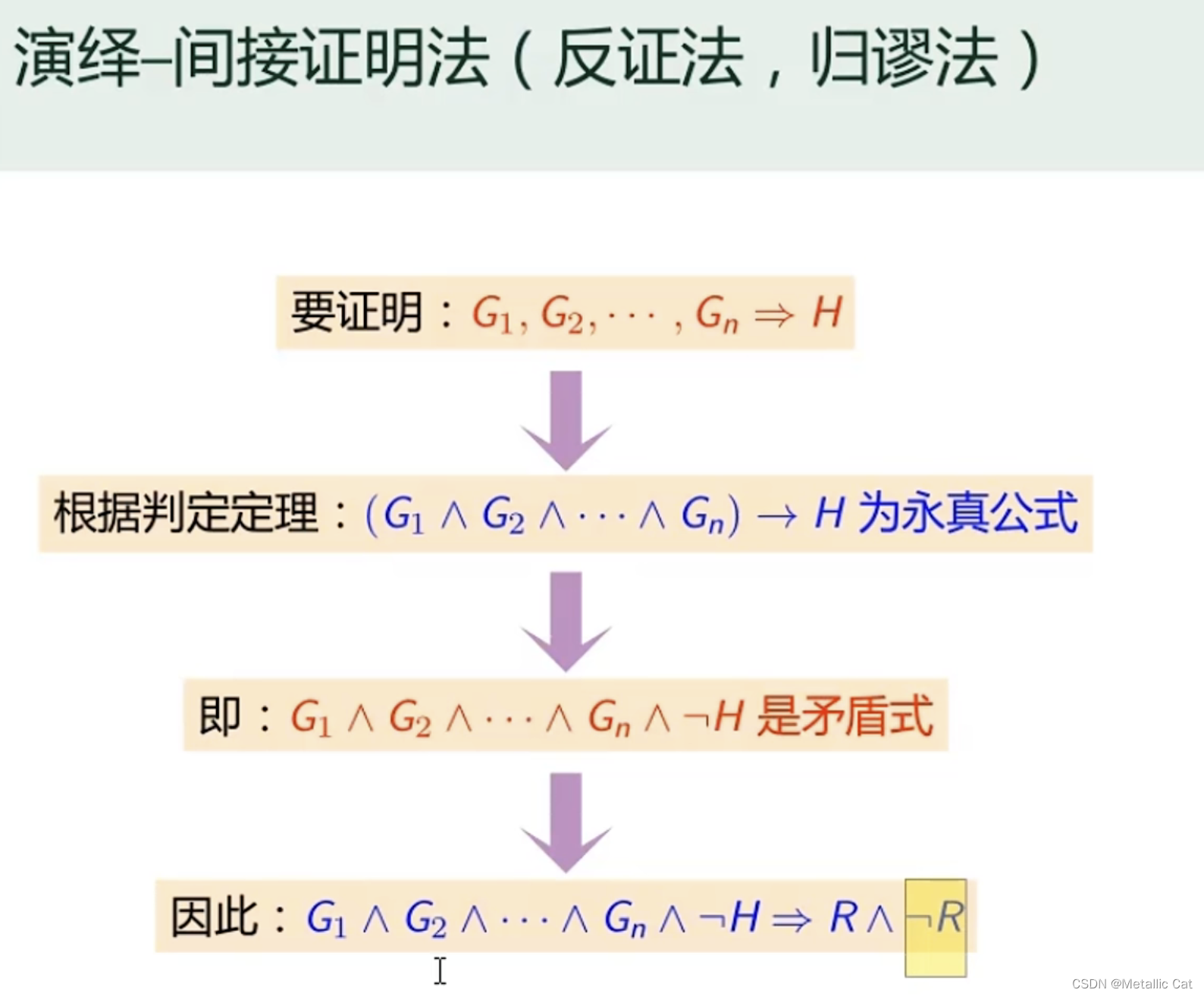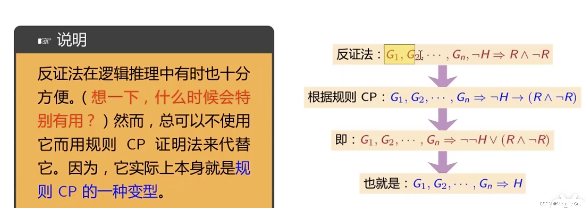 上面这个翻译过来就是:如果将条件和结论的否定合取在一起后得到一个矛盾式的话,则能够反证出结论H是条件的逻辑结果 --- 即条件和结论H之间是蕴含关系、