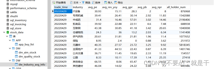 - #将数据交易日、行业、市盈率、市净率、收入同比、毛利率、净利润等指标统计数据存入数据库中