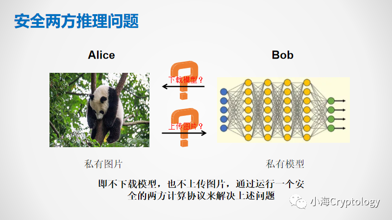假如存在这样的一个场景,Alice拥有一张私有的图片,Bob拥有一个图片识别神经网络模型。现在需要Alice调用Bob的模型来识别自己的私有图片。解决方法有两种,一种是Alice下载模型,但这是属于Bob的私有数据是不被允许的。一种是Alice上传私有图片,但这样Alice的隐私又遭到泄露。因此安全两方推理问题就是为了解决:即不下载模型,也不上传图片,通过运行一个安全的两方计算协议来解决上述问题。