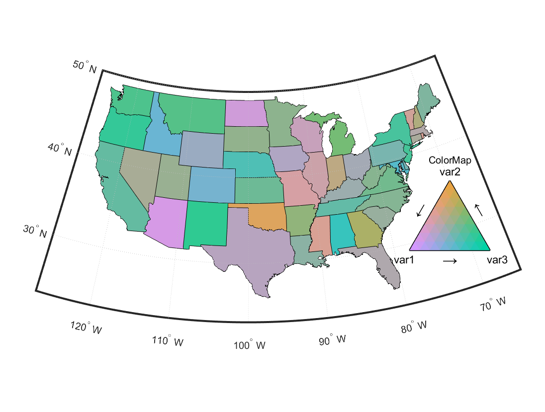 [CMapData,CMapHdl]=multiVarMapTri(A,B,C,'colorList',6,'pieceNum',8);