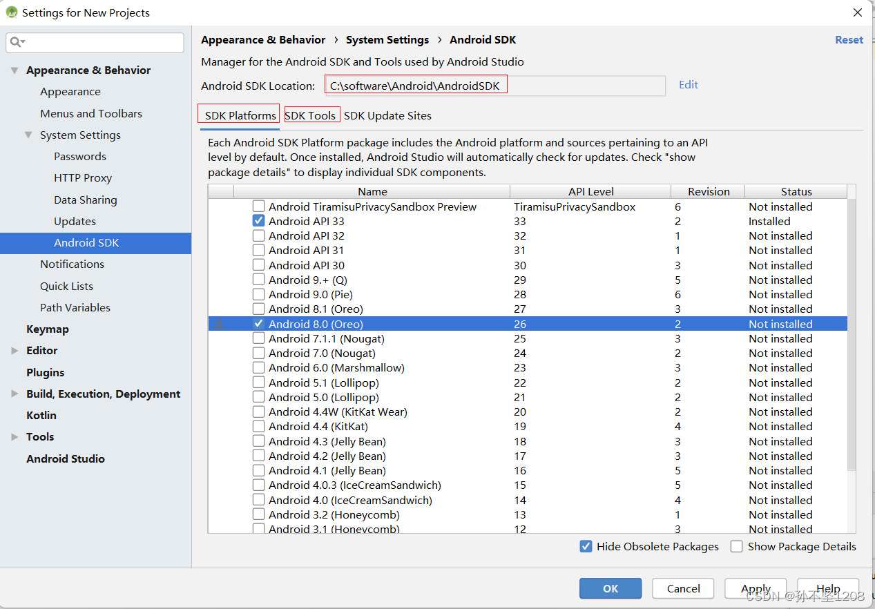然后我们可以通过Settings >> Appearance >> System Settings >> Android SDK查看