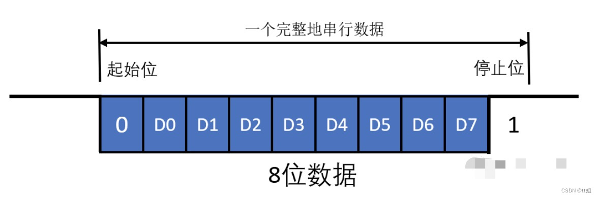 起始位: 起始位必须是持续一个比特时间的逻辑0电平,标志传输一个字符的开始,接收方可用起始位使自己的接收时钟与发送方的数据同步。