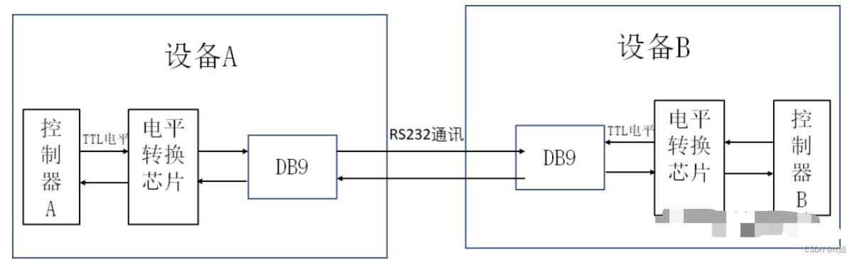 在上面的通讯方式中,两个通讯设备的"DB9接口"之间通过串口信号线建立起连接,串口信号线中使用"RS-232标准"传输数据信号。由于RS-232电平标准的信号不能直接被控制器直接识别,所以这些信号会经过一个"电平转换芯片"转换成控制器能识别的"TTL校准"的电平信号,才能实现通讯。