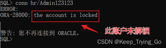 可以看到hr用户未解锁,现在开始解锁(注意这里的解锁须再sysdba超级管理员权限下进行):