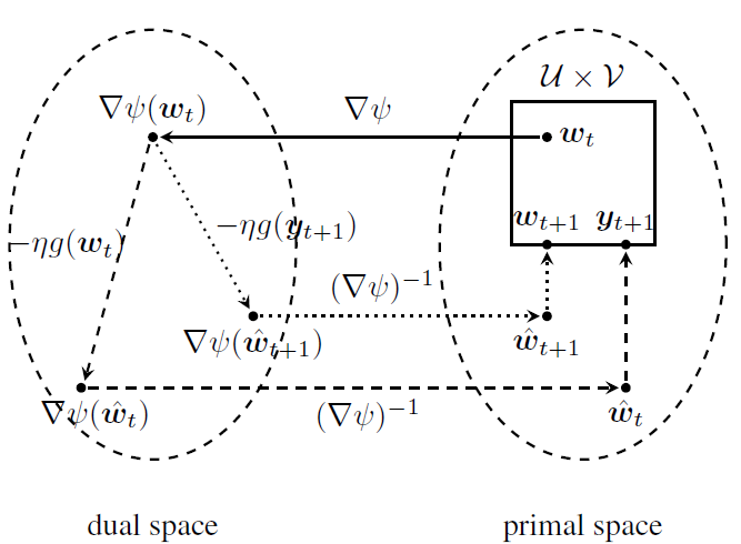 有了 y t + 1 ≜ [ u t + 1 ; v t + 1 ] \boldsymbol{y}_{t+1} \triangleq\left[\boldsymbol{u}_{t+1} ; \boldsymbol{v}_{t+1}\right] yt+1≜[ut+1;vt+1]后,从 w t \boldsymbol{w}_t wt;当在对偶空间执行梯度下降时,使用 y t + 1 \boldsymbol{y}_{t+1} yt+1而非 w t \boldsymbol{w}_t wt。换言之,一个两步镜像下降方法在每次迭代中执行,其从同一点开始,但第二次使用的梯度在第一次的结束点进行评估。该过程已被证明有很好的收敛性。 图2展示了该方法的一次迭代。