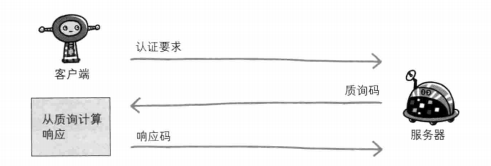 一开始客户端会先发送认证要求给服务器,接着使用客户端使用接受到的质询码(每次生成的任意随机字符串)计算生成响应码。最后将响应码返回给对方进行认证。