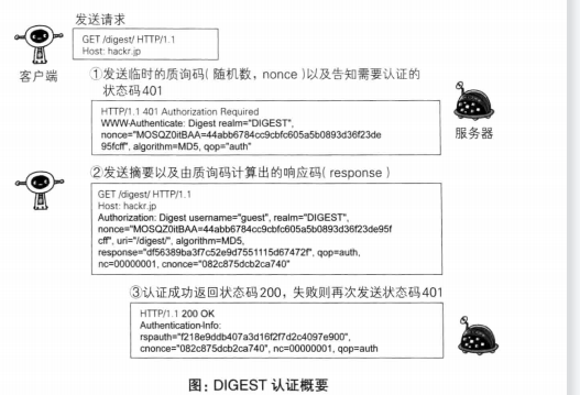为弥补BASIC认证存在的弱点,从HTTP/1.1有了DIGEST认证。