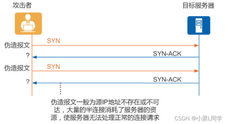 syn flood攻击利用tcp三次握手机制,攻击者向服务器发送大量的syn报文请求,当服务器回应了ACK-SYN报文后,不再继续回应ACK,导致服务器上建立了大量半连接,直至老化,造成服务器的资源被半连接耗尽,正常的请求无法回应。
