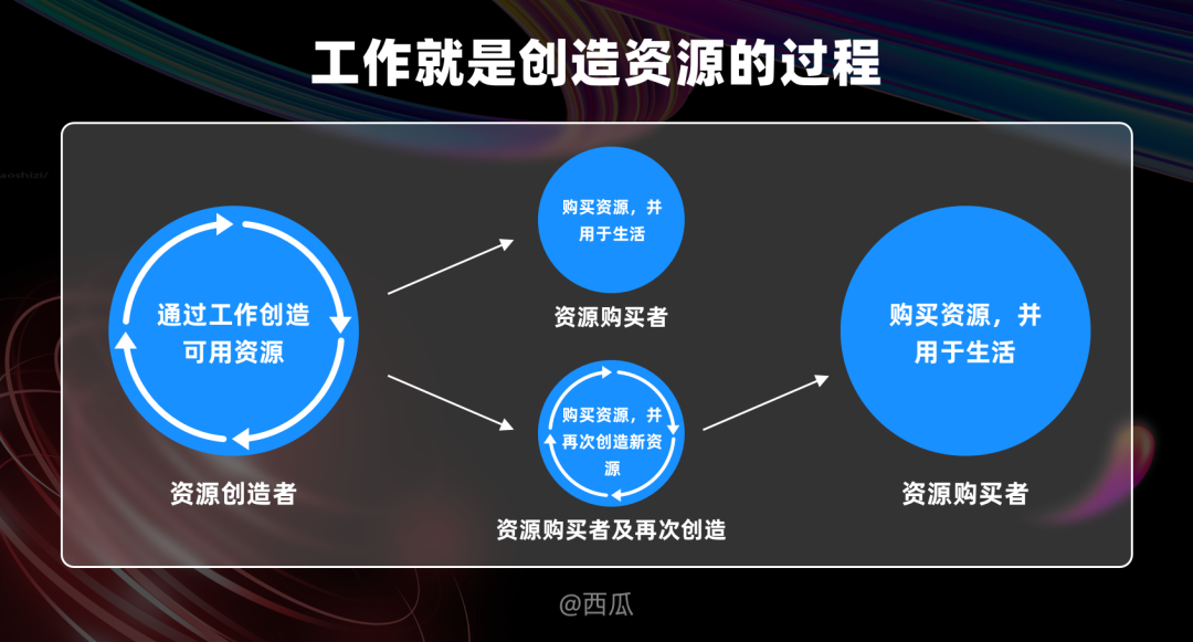 那么回到标题核心,到底什么才是工作,其实就在这四个问题里,这里先不回答这四个问题,我先简单用一句话说透工作本质。所谓工作就是劳动者通过劳动将生产的资源转换为生活资源以满足人们生存和继续进行社会发展的事业过程。