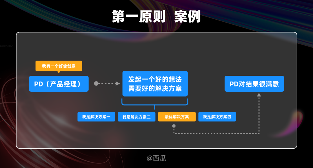 案例一:小组开会,目前没有完整的PRD文档,只有一个很简单的想法,或者是从用户那刨来的真需求,那么这就属于问题本质,这个时候运用“第一原则”的发散思维,用多种可行方案进行解决即可。俗话说“不管黑猫白猫,能抓住老鼠的就是好猫”,同样道理,不管你用什么高端模型或者算法,你把这个问题解决了就可以,这就是工作,因为他属于有价值的资源创造,会被他人买单并再次运用到其他地方。