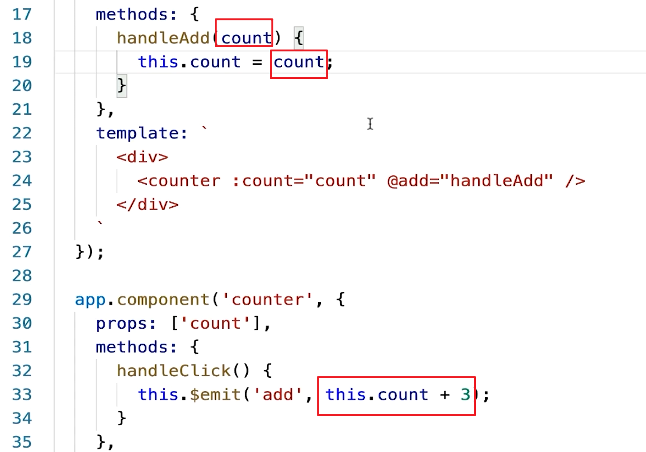 当我子组件被点击的时候,触发 add 事件的时候,可以直接把新的count值在这里算出来,比如说你让count加3。代码改造如下:
