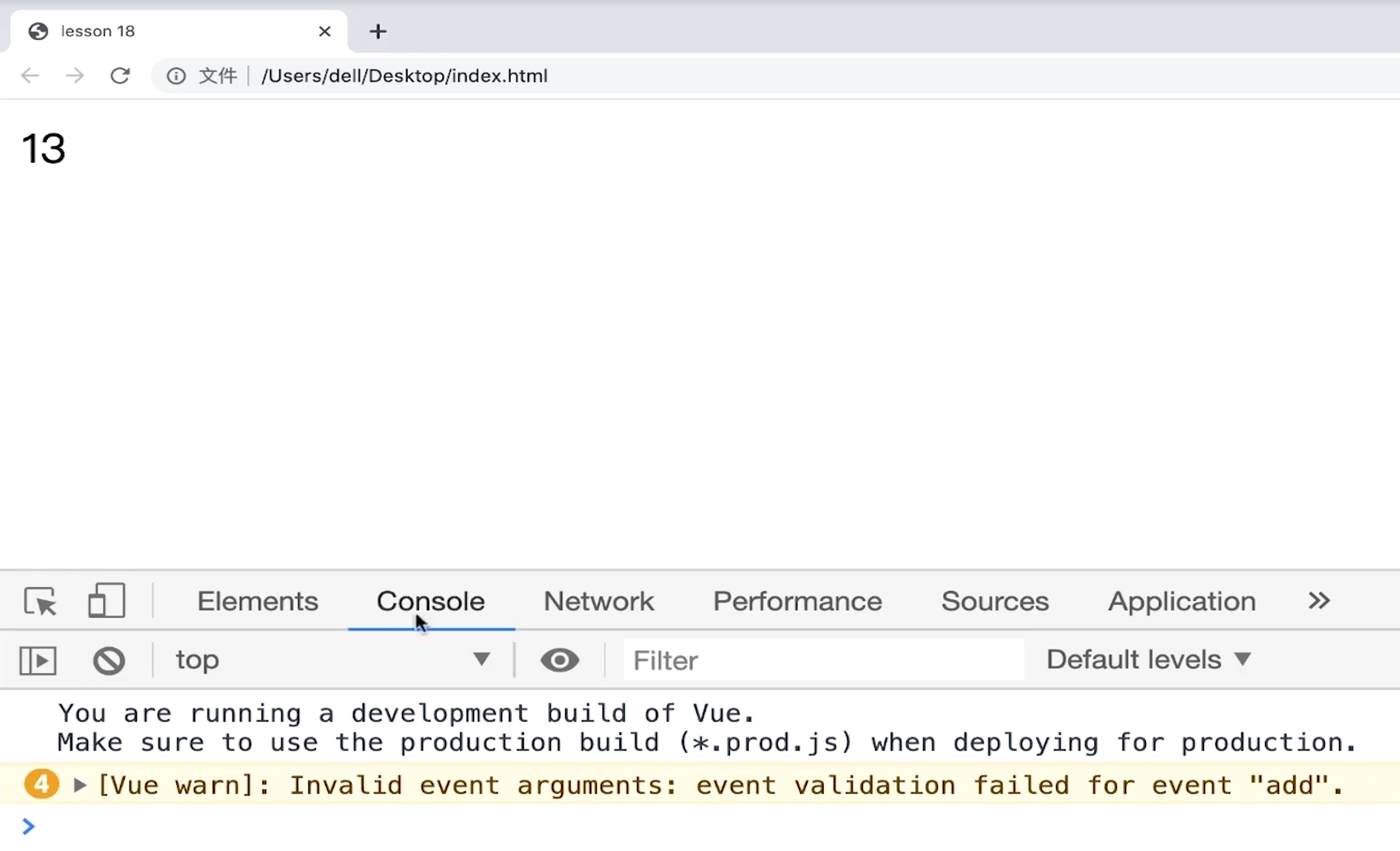 大家会发现它会告诉你,你尝试在修改 prop 里面传递过来的count,它是一个只读的参数,你不能去修改它。这是Vue里面单向数据流的概念。