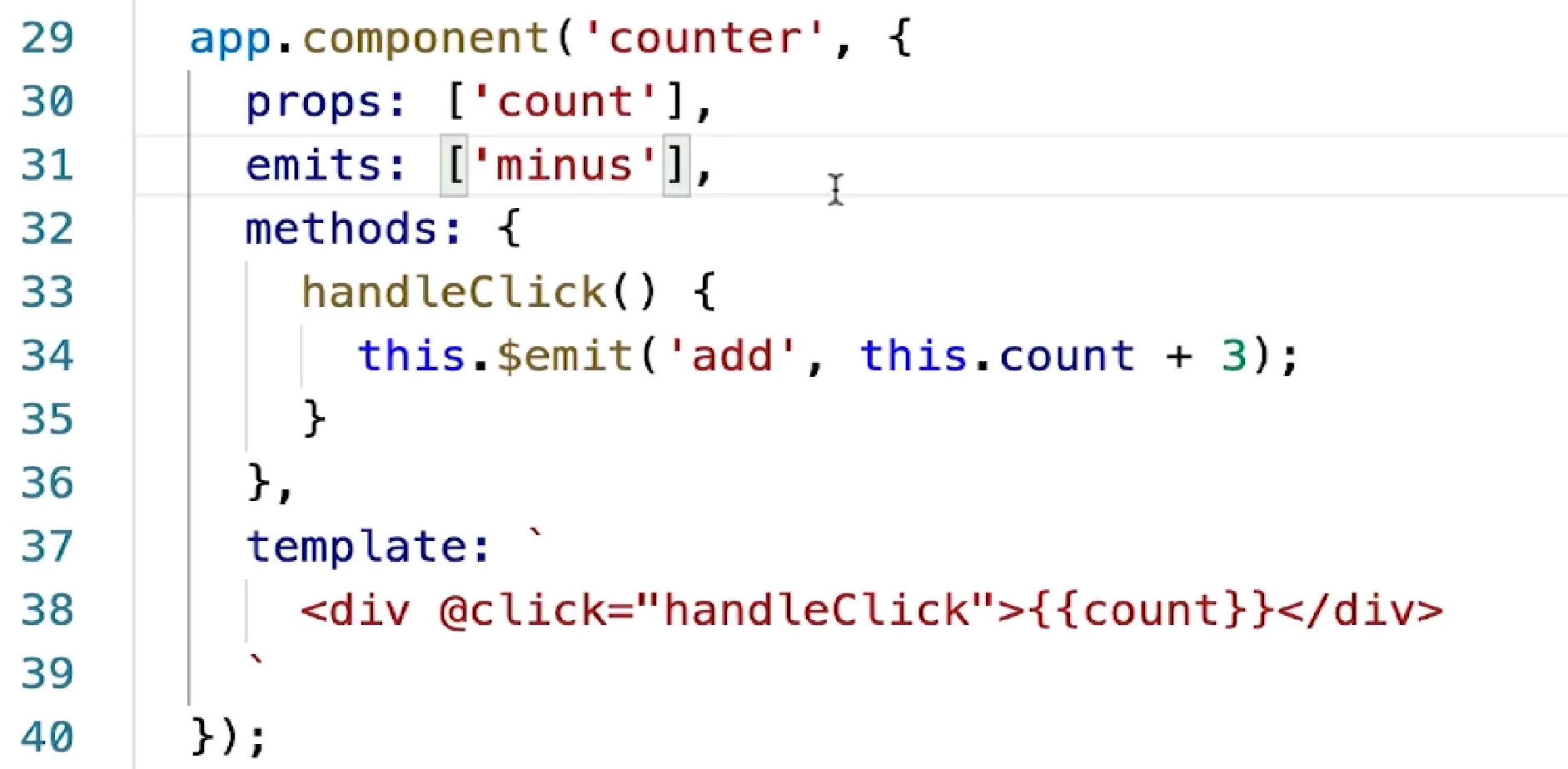 当然这个事件后面其实你还可以写一个函数,它会接收到你向外传递的参数的值,比如说你触发 add 事件的时候,向外传递的参数是不是只有一个,它是一个count 嘛,我可以在这里做一个判断,if count 大于零,return true,否则我就return false。