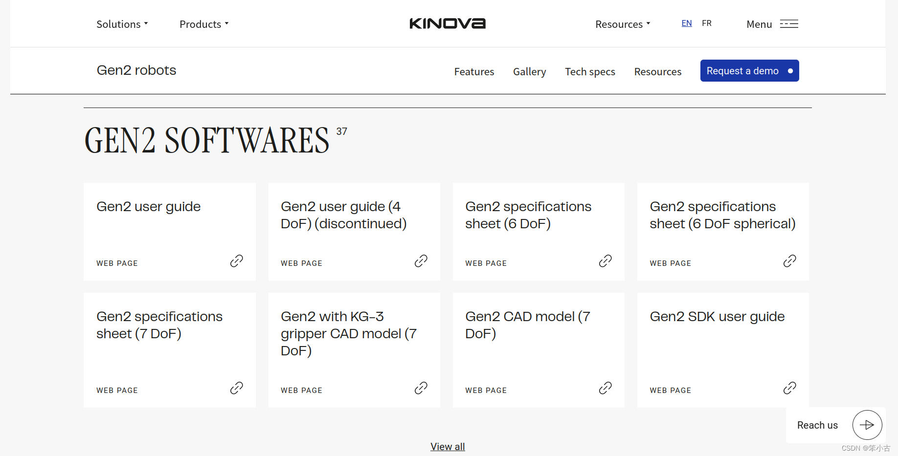 2.鼠标放在页面上方Products,然后根据机械臂型号选择,我这里点击Gen2 robots页面往下滑动直到GEN2 SOFTWARE