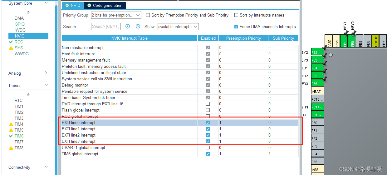触摸按键的输出端连接到了PE0~PE3。PE0~PE3是EXTI0~EXTI3。