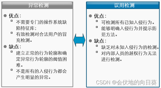 缺点:需要不断的升级以对付不断出现的异常攻击手法,不能检测到从未出现过的黑客攻击手段