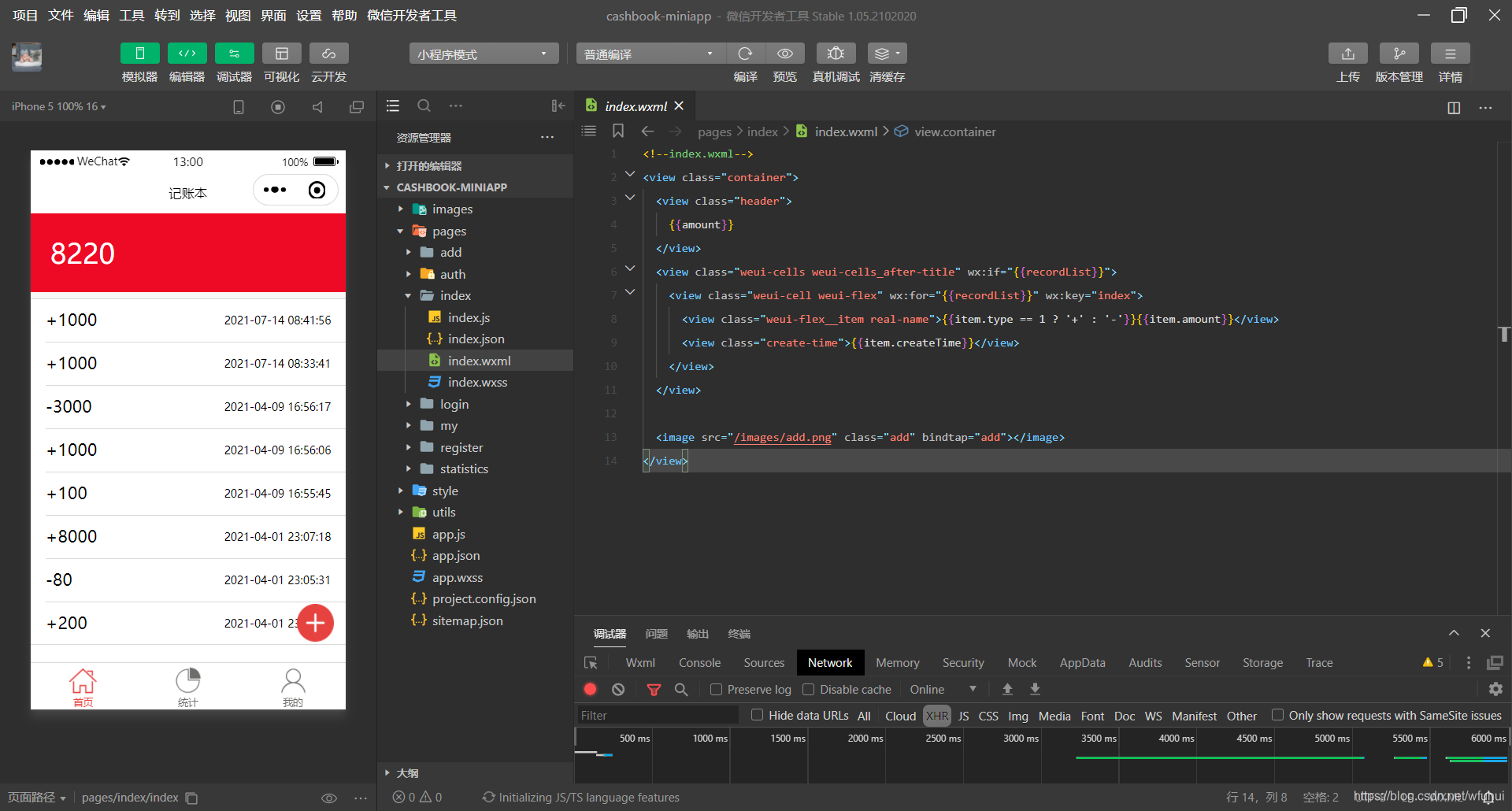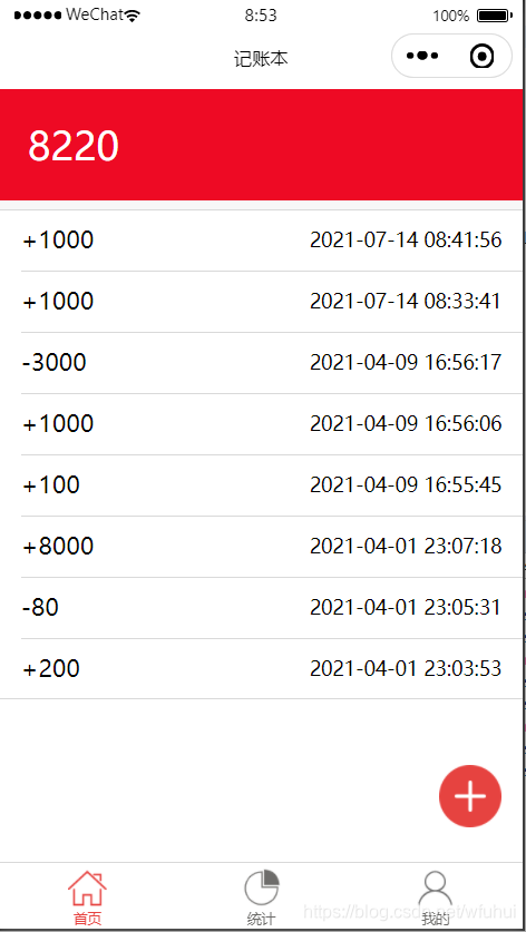 首页显示余额,以及记账记录,点击新增按钮新增记账