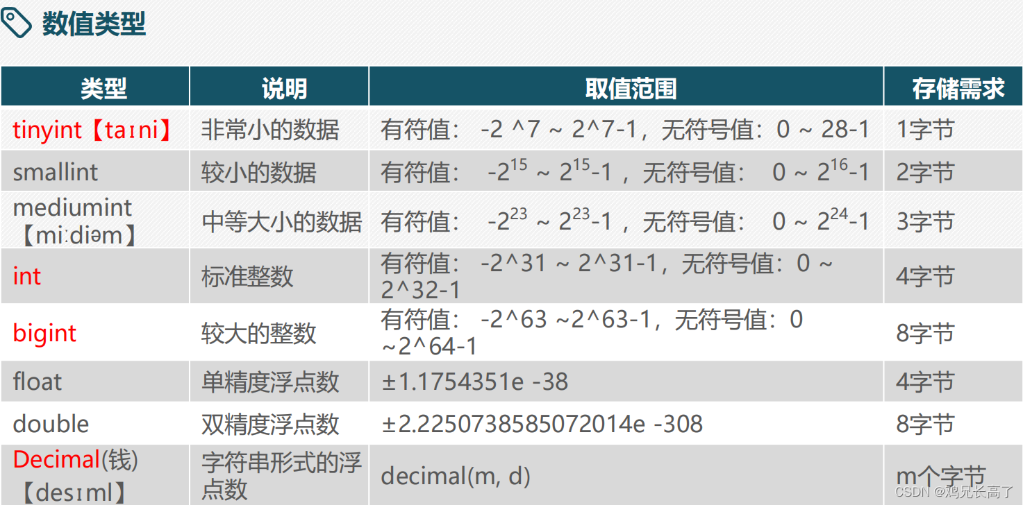 之所以不使用浮点型来存储钱等一类需要十分精确的数值的原因是,在不同的计算机中,浮点型的精度是不同的,Decimal类型的第一个属性值为总长度,第二个为小数位数。例如成绩可以将类型设置为Decimal(4,1)。