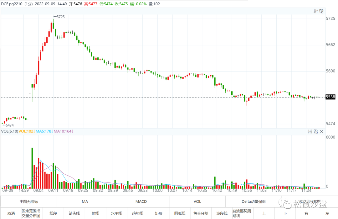 LPG高开高走,顶部的DELTA值放出空头巨量,同时在顶部形成空头堆积后,空头流畅下跌,后面形成多次空头堆积,空头占据主导地位。