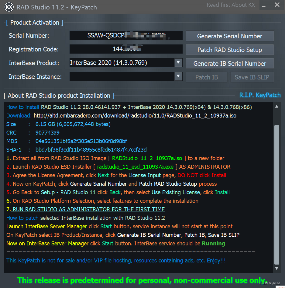 4.现在打开KeyPatch上,单击[Generate Serial Number]生成序列号,再单击[Patch RAD Studio Setup]修补RAD Studio设置过程