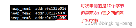 这是因为,操作系统开辟空间的时候会多开辟一部分空间来存储这块堆区申请空间的属性信息,比如大小等,所以连续开辟的空间之间不会紧挨着,会有空间来存储属性。
