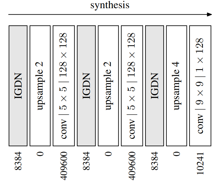 类似地,合成变换 g s g_s gs有三个阶段,每个阶段由IGDN、上采样和卷积组成。设 u ^ i ( k ) ( m , n ) \hat{u}^{(k)}_i(m, n) u^i(k)(m,n)为第 k k k个合成阶段的输入,则 y ^ \hat{\boldsymbol{y}} y^对应于 u ^ i ( 0 ) ( m , n ) \hat{u}^{(0)}_i(m, n) u^i(0)(m,n); x ^ \hat{\boldsymbol{x}} x^对应于 u ^ i ( 3 ) ( m , n ) \hat{u}^{(3)}_i(m, n) u^i(3)(m,n)。