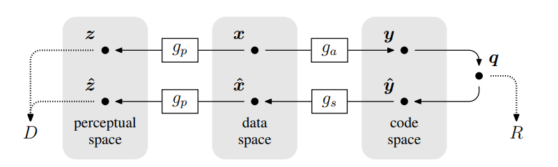 (4) 失真(distortion) D D D通过使用(固定)变换 z = g p ( x ) \boldsymbol{z}=g_p(\boldsymbol{x}) z=gp(x)和 z ^ = g p ( x ^ ) \hat{\boldsymbol{z}}=g_p(\hat{\boldsymbol{x}}) z^=gp(x^)变换到感知空间(perceptual space),并用评估度量 d ( z , z ^ ) d(\boldsymbol{z},\hat{\boldsymbol{z}}) d(z,z^)来评估失真。