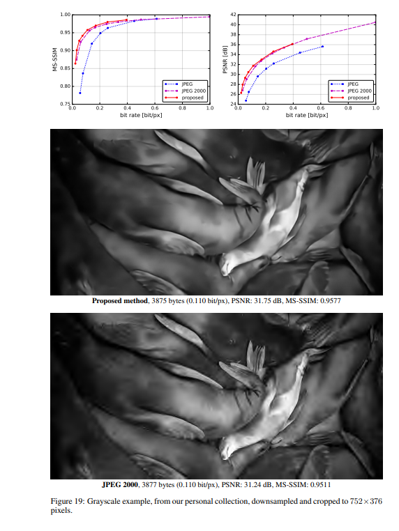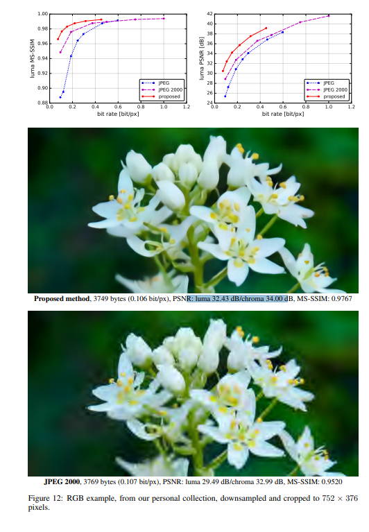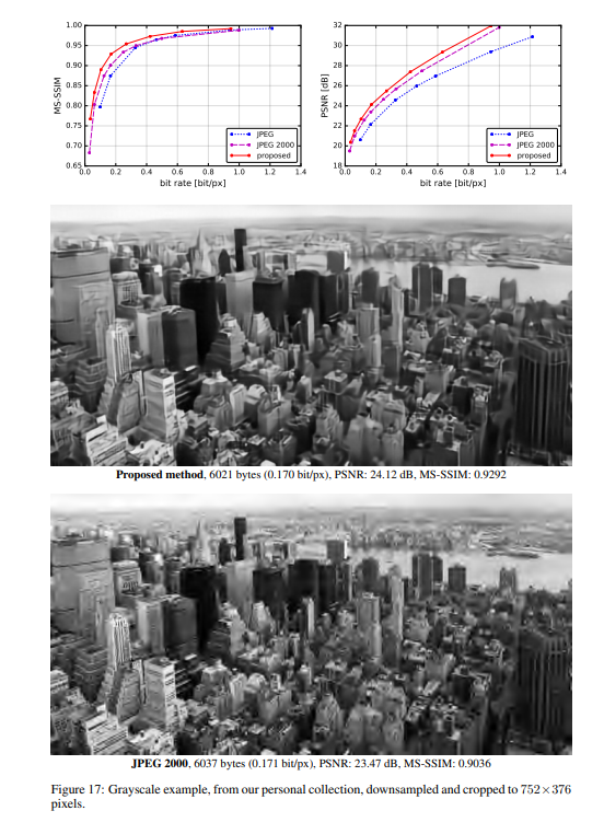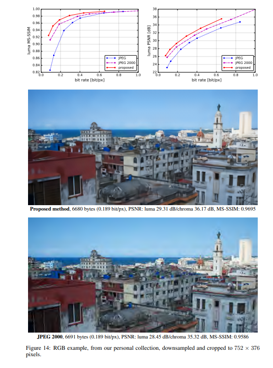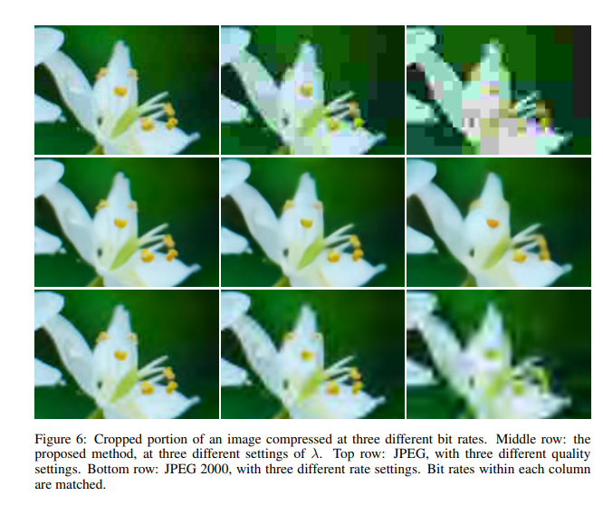 作者将提出的方法与JPEG和JPEG 2000作比较。对于这篇论文提出的方法,所有图像均使用均匀量化进行量化(使用加性噪声的连续松弛仅用于训练目的)。另外,在推理阶段,作者还基于上下文的自适应二进制算术编码框架(CABAC;Context-Based Adaptive Binary Arithmetic Coding in the H.264/AVC Video Compression Standard,https://ieeexplore.ieee.org/document/1218195)实现了一个简单的熵编码(详细见原论文6.2)。