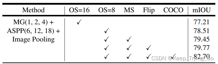 从图中可以看到当multi-grid为(1,2,1)的效果是最好的,并且这里的膨胀系数等于rates*multi-grid(r1,r2,r3).