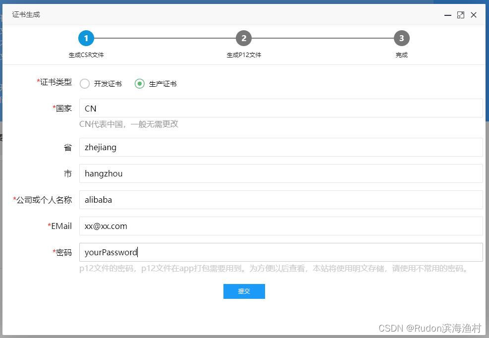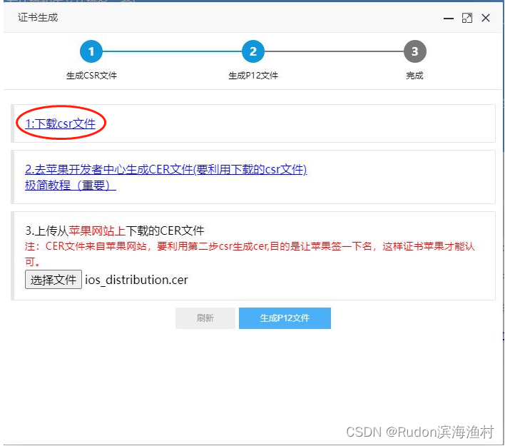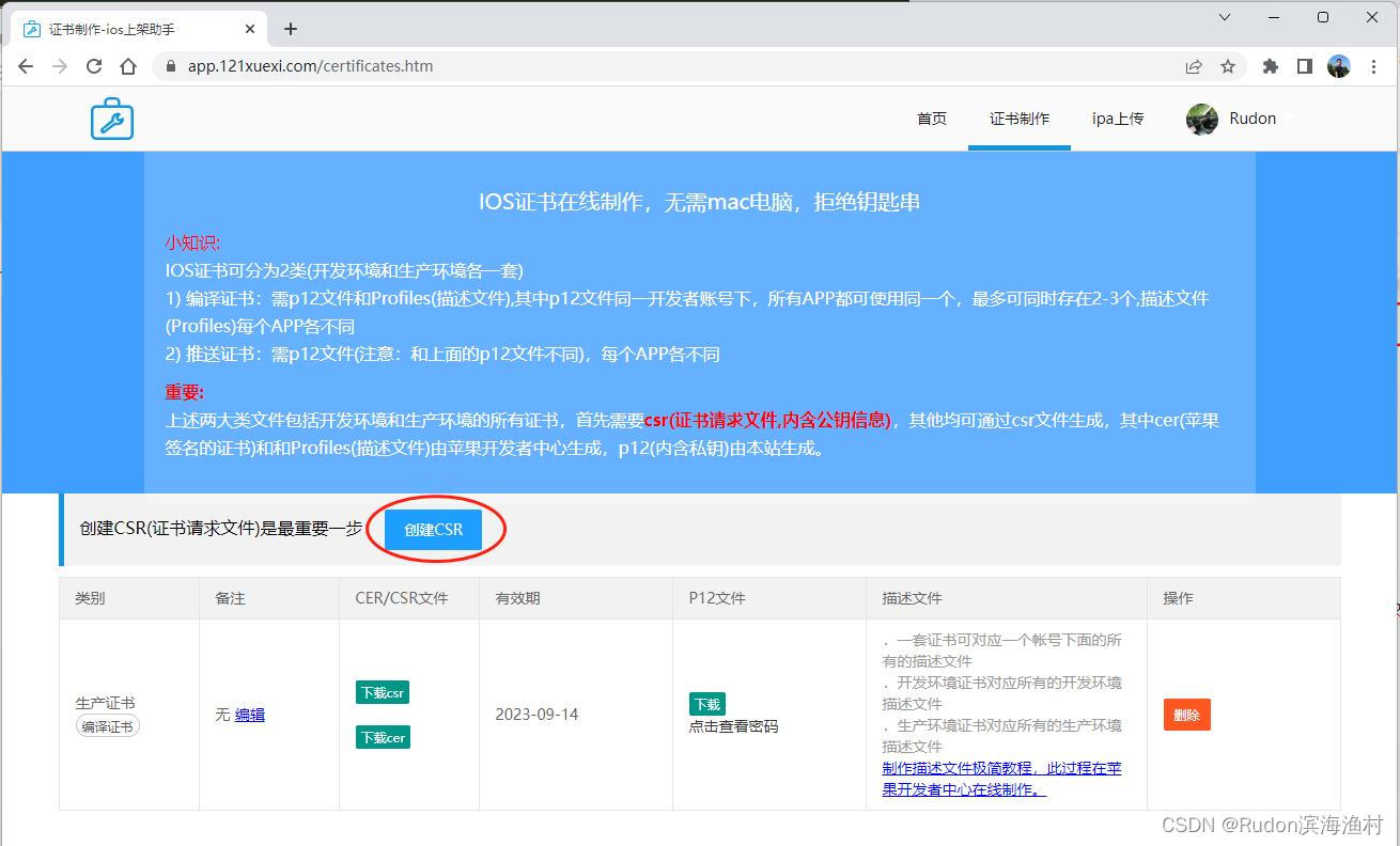 打开 https://app.121xuexi.com/certificates.htm 继续上传刚才的csr文件,点击“生成P12文件”