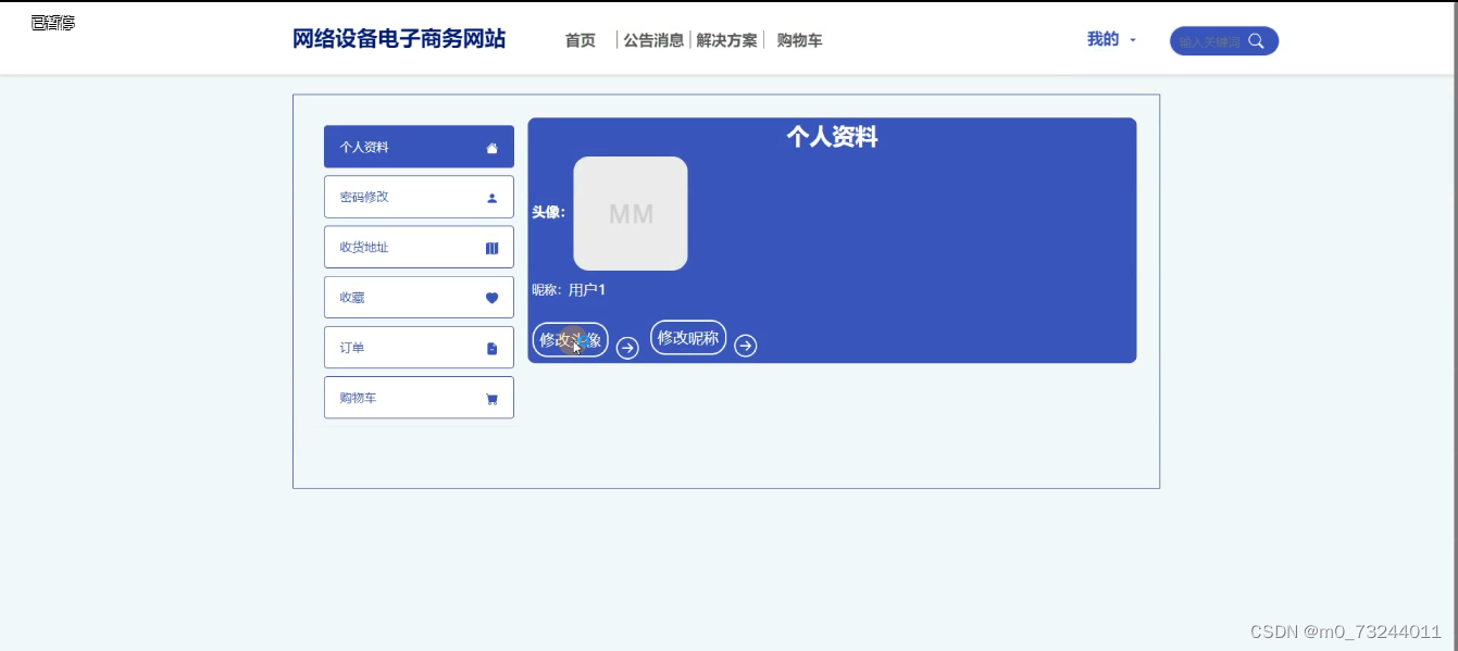 (2)查看网络设备电子商务网站的首页信息:网络设备电子商务网站的首页信息包含了首页、公告消息、解决方案、购物车、我的(我的账户、我的收藏、我的地址、我的购物车、我的订单、个人中心)等。
