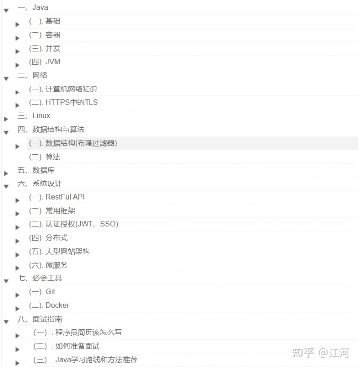 除了按大厂,我还按Java后端面试的维度,给你梳理Java面试的20多个核心技术点:基础、容器、并发、JVM、计算机网络知识、HTTPS中的TLS、操作系统、Linux、数据结构(布隆过滤器)、算法、 MySQL、Redis、RestFul API、常用框架、认证授权(JWT、SSO)、分布式、大型网站架构微服务、 Git、Docker、程序员简历该怎么写、如何准备面试、Java学习路线和方法推荐,全都包含在里面!