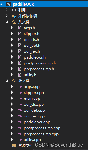 至此,依赖方面的就弄好了。现在应该还有paddleOCR源文件没有加入进来。即,将paddleOCR源文件和main.cpp文件同一路径,效果如下: